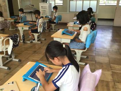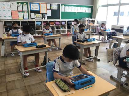 9月1日(金)、3年生は、音楽を鑑賞し、タブレットのメモ機能を使って感想を書いています。お互いの感想をすぐに見合うことができます。ローマ字入力に苦戦しながら、がんばって文を書いています。