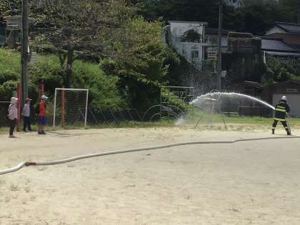 最後は、消防団が放水訓練パーフォマンスを行いました。プールの水を運動場まで引いての放水です。