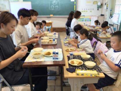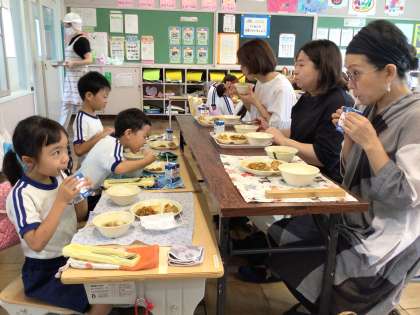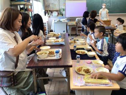 にこにこ笑顔で、お家の方と一緒に食べた給食はとてもおいしそうでした。