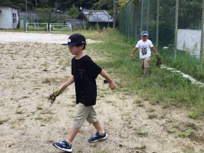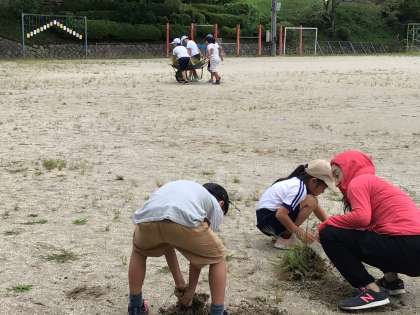 9月8日(金)、2年生が運動場の草取りをがんばりました。「草取り、みんなでやろう」と声をかけた子たちがいて、みんなで取り組むことになったそうです。