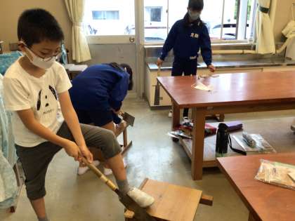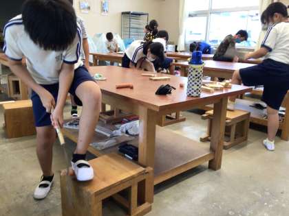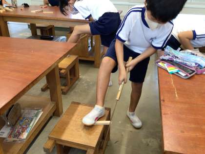 9月12日(火)、4年生は図工の学習でのこぎりを使って、ギコギコ木を切っていました。力の入れ方が難しく、汗をいっぱいかきながら、がんばっていました。