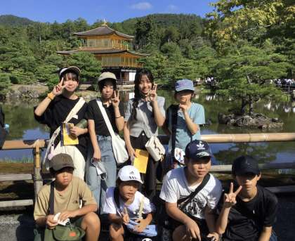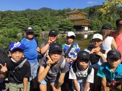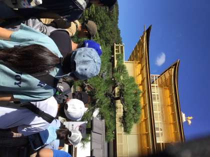 続いて、金閣寺です。金閣寺の姿が見えると「すごい」と声が上がりました。青空に金閣寺が映えています。すごい人混みの中をぬって、写真を撮りました。