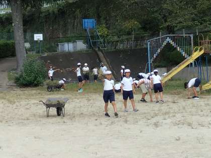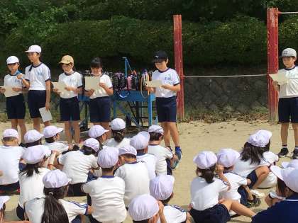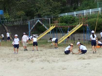 はじめの会で、ルールや注意することを聞いたら、早速学年対抗して草取り大会の開始です。