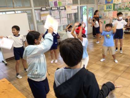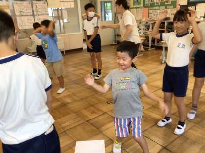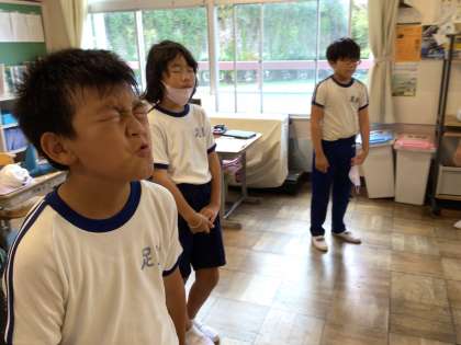 9月22日(金)、朝のおしゃべりタイムは身体ほぐしの体操からです。体を柔らかくして、声を出す準備をします。