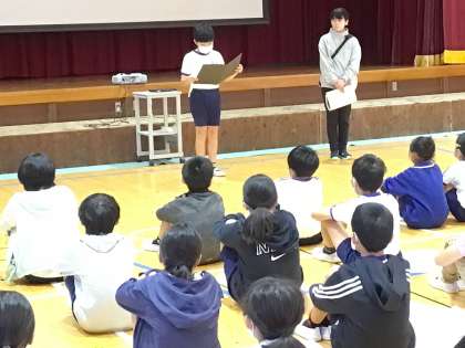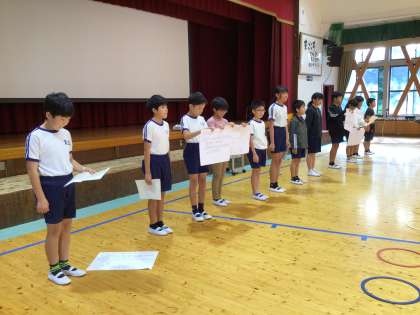 全校集会 5年生からのTAKE ACTION 1 公開日 2023/09/25 更新日 2023/09/25 各学年から 今日の全校集会では、8月に豊田市青少年赤十字のリーダーシップトレーニングセンターに参加した児童が、その活動と学んできたことを発表しました。また、その学びを生かして、今、足助小学校で気になる「あいさつ」について、5年生発信のTAKE ACTIONに取り組むことを話しました。
