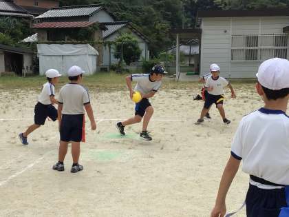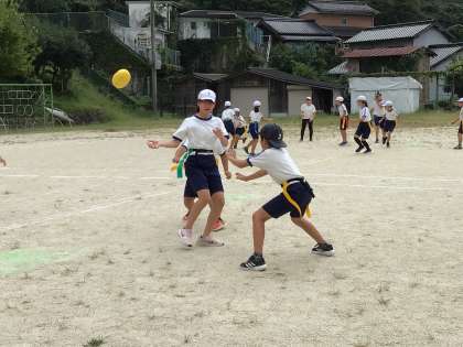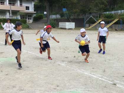 9月28日(木)、5・6年生の体育はタグラグビーです。折しも、ラグビーワールドカップが開催中です。後ろにしか、パスできないルールに苦戦しながらも、楽しそうにトライを決めていました。