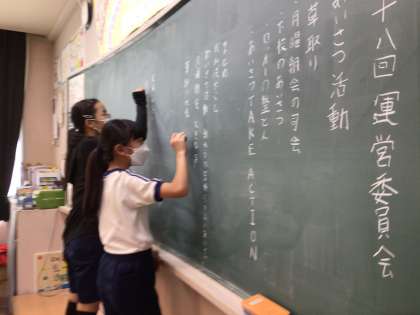 前期委員会 最終日 運営委員会 公開日 2023/10/02 更新日 2023/10/02 特別活動 運営委員会で取り組んだことは、黒板いっぱいに並びました。全校のリーダーとして、進んで行動してきた運営委員会さん。ありがとう。