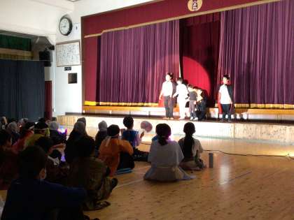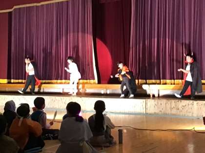 校内学芸会 わくわく 公開日 2023/10/11 更新日 2023/10/11 学校行事 校内学芸会は、わくわく学級からスタートです。ノリのいいダンスに、みんなで手拍子。ばっちり決まりました。 今日は、劇、出し物が終わると、舞台背景をバックに写真を撮りました。