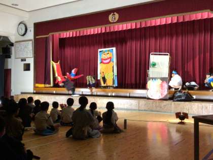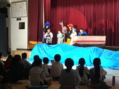 次は、中学年の「じごくのそうべえ」です。子どもたちの協力とがんばりで場面転換していく大道具や背景の中、4人と鬼たちが地獄を巡ります。