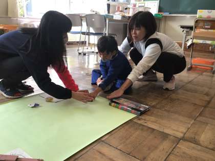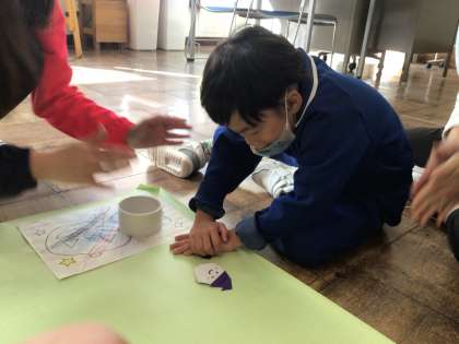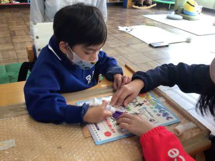 わくわく2 できました! 公開日 2023/10/17 更新日 2023/10/17 各学年から 10月17日(火)、わくわく2学級さんは、のり付けにチャレンジしました。折り紙にのりをとんとんとつけて、貼りたいところにぎゅっと押すこと、できました!ハロウィンの飾り付けです。
