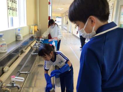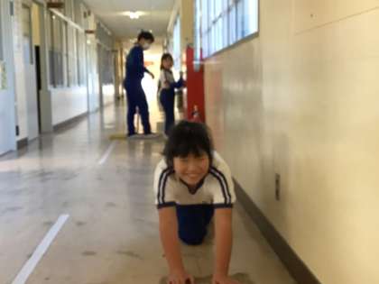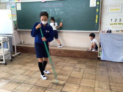 高学年に教えてもらいながら、掃除のやり方を覚えていきます。