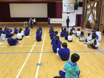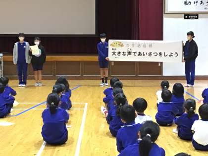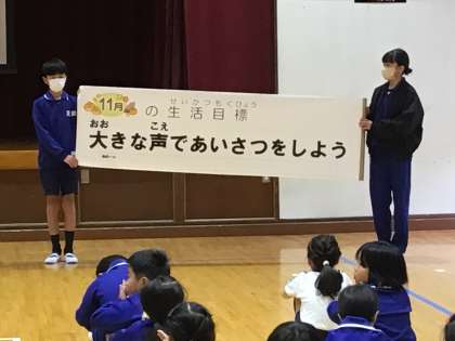 全校朝会 11月の目標 公開日 2023/11/06 更新日 2023/11/06 校長室から 全校朝会の最後に、運営委員会が11月の目標を発表しました。11月のテーマはあいさつです。この頃、朝、遠くから「おはようございます」の元気な声が聞こえてくるようになりました。この素敵なあいさつがもっともっと広がるといいなと思います。運営委員会さん、よろしくお願いします。