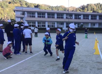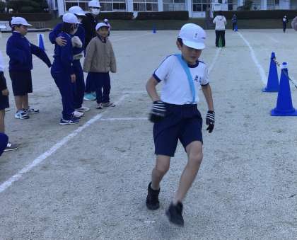 運動場にコーンを置いて回り、タスキを渡す子を確認していきます。