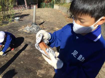2年生 焼き芋 2 公開日 2023/11/22 更新日 2023/11/22 各学年から 祈りが通じ、おいしい焼き芋が出来上がりました。大喜びです。給食後だったので、残った分は家に持ち帰ります。家で家族と食べてくださいね。