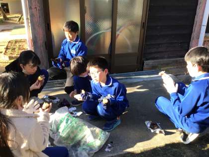 焼けたお芋を割ると、「おいしそう」の声が漏れます。皮もクリームみたいにおいしいと、焼き芋をしっかり味わった5年生です。