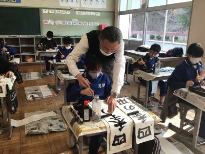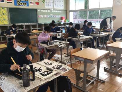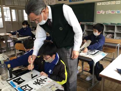 熱心に書き初め練習に取り組んでいる5年生。手を取って教えていただき、とても上手になりました。
