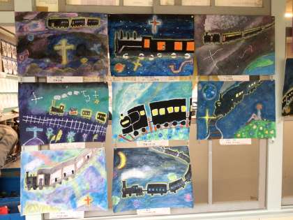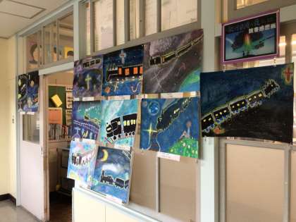 6年生教室前廊下に、読書感想画が掲示されています。すてきな銀河が広がっています。