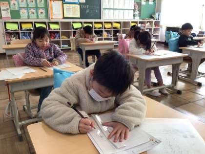 初めて書き初めに取り組む1年生。一文字一文字、手本をよく見て、濃く、丁寧に書いていました。