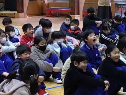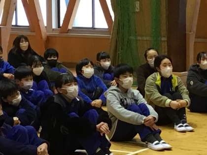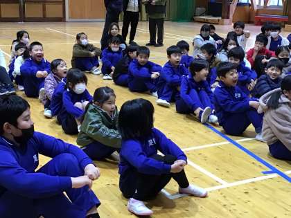 お話では、クイズを考えながら、「間合いをとる」「大きな声を出す」「捕まったら、ジタバタする」など、不審者に対する方法を実践を交えて教えていただきました。
