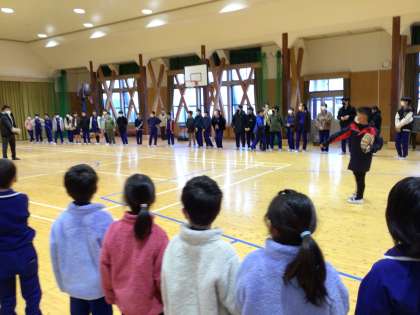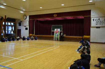 全校が、グローブにタッチした後には、先生や児童の希望者がかっこいいキャッチボールを披露しました。ボールがグローブにおさまる、ビシッと言う音が講堂に響きました。