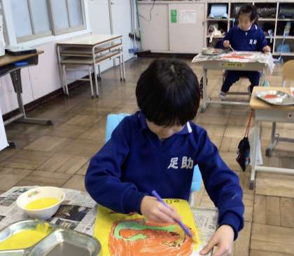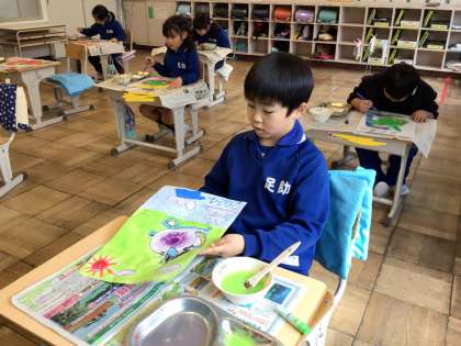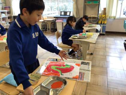 1月15日(月)、凧の絵の色塗りをしている2年生です。勢いよく、辰が空に舞い上がりそうです。