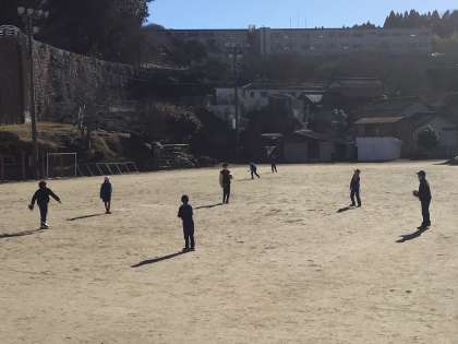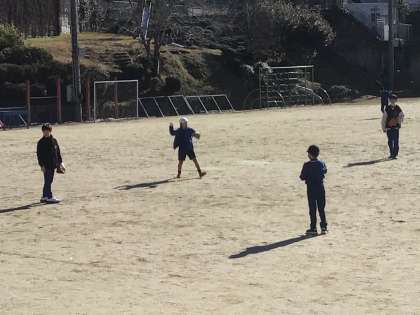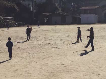 1月17日(水)、昨日に引き続き、6年生がグローブを使っています。奥には、明日グローブが使えるのを待ちわびているだろう5年生が、バットを振っています。