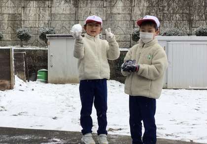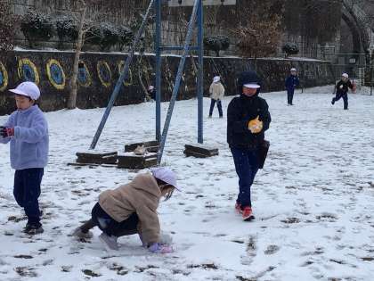 1月24日(水)、2時間目に早速雪遊びを始めた1・2年生です。 雪だるまもできました。