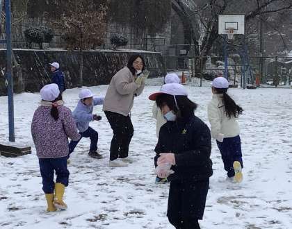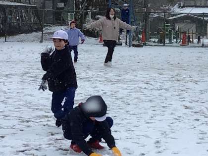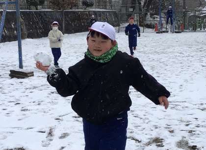 雪合戦も始まります。「当ててもいいですか」と先生たちに尋ねてから、雪玉を投げる優しい子どもたちです。