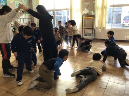 2年生だけでは目が回りそうだった「ロンドン橋」も1年生と一緒だと、列になって回ることができます。「おちゃらかほい」でも盛り上がっていました。