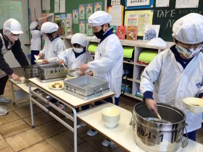 1年生 給食の配膳 公開日 2024/01/31 更新日 2024/01/31 各学年から 1月31日(水)、今日の給食は大好きな子が多い唐揚げです。1年生も給食当番さんがしっかり配っていました。当番さんではない子は静かに座って待ちます。