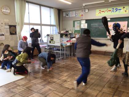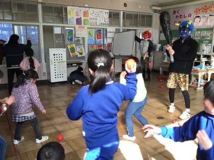 2月2日(金)、一足早く足助小学校に鬼が現れました。豆ならぬ赤玉や落花生を手に鬼退治です。
