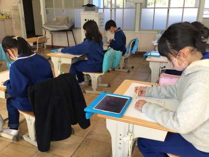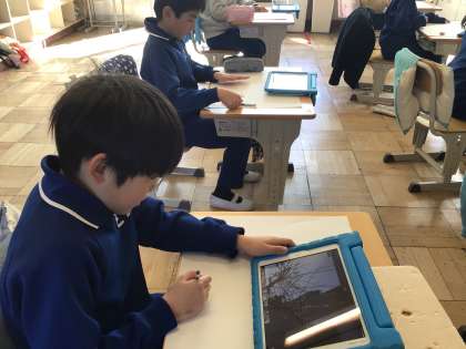 3年生 図工「春を描こう」 公開日 2024/02/27 更新日 2024/02/27 各学年から 2月27日(水)、3年生は、学校の中で見つけた「春」をタブレットで写真を撮り、そのまま絵に描くことに取り組んでいました。花が咲いた梅の枝ぶりを描いたり、プランターの花を大きく描いたりしていました。