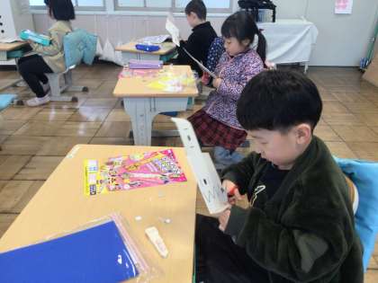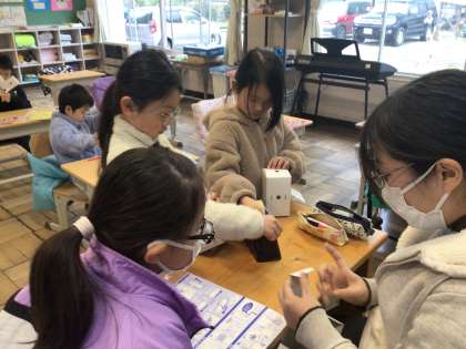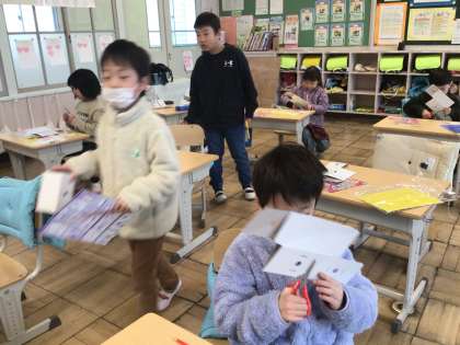 1年生 図工 にょきにょきとびだせ 1 公開日 2024/03/05 更新日 2024/03/05 各学年から 3月5日(火)、1年生の図工は、にょきにょきのびる工作に挑戦です。 はじめに、箱を組み立てます。自分が作りたいものになるように切ったり、テープで貼ったりして組み立てていきます。