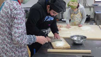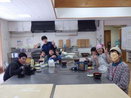最後は、細く切って茹でたら完成です。持っていったおかずと一緒においしくいただきました。
