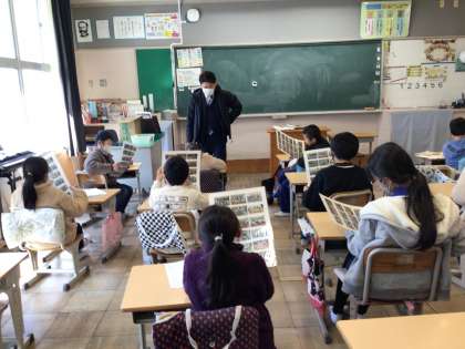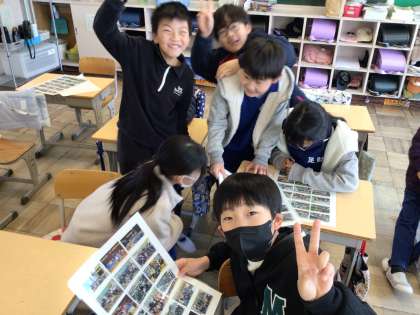 4年生は、1年間の集合写真を鑑賞していました。