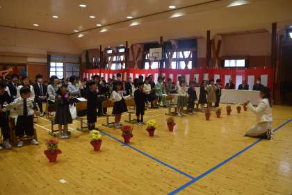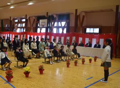 ぴかぴかの1年生10人は、入学認定で名前を呼ばれると、一人ずつしっかりお返事ができました。
