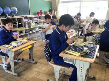 4月9日(火)、給食の様子です。今年は、給食はじめの10分間をもぐもぐタイムにしています。