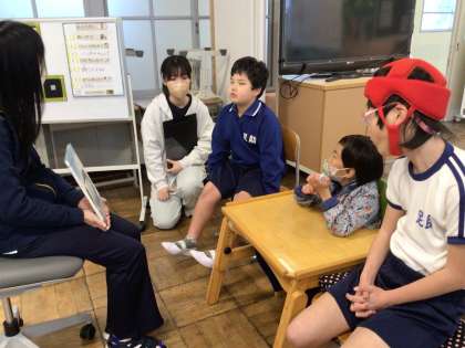 わくわく お話のことを話そう 公開日 2024/04/09 更新日 2024/04/09 各学年から 4年生9日(火)、わくわく学級は、読み聞かせを聞いて、その感想を伝え合いました。自分が面白いと思ったこと、気に入ったページなどをそれぞれ発表しました。