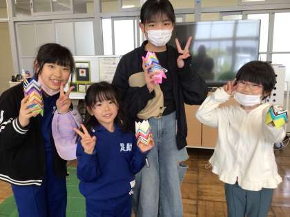 折り紙のプレゼント 公開日 2024/04/11 更新日 2024/04/11 校長室から 4月11日(木)、6年生の子と1年生の子が折り紙を作ってプレゼントしていました。とてもたくさん作っていました。重なり合っていて、きれいです。私(校長)には、金色のものを届けてくれました。ありがとう。