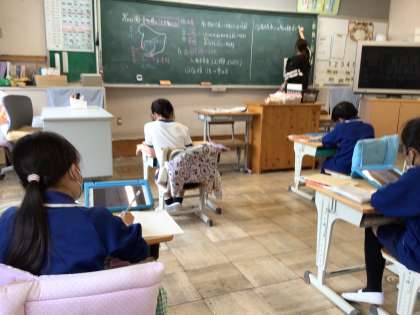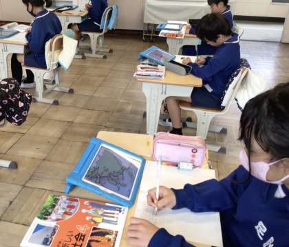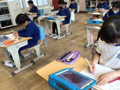 4月18日(木)、4年生の社会は愛知県の学習です。3年生の社会からさらに視野を広げて、自分たちの住む県のことを学習します。タブレットの資料を見ながら、愛知県の形もノートに書いていました。