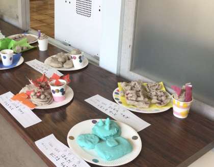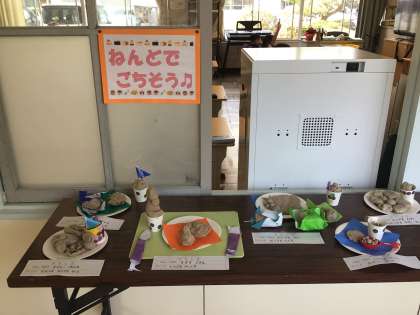1年生教室の廊下の作品です。見ると、元気が出る作品ばかりです。