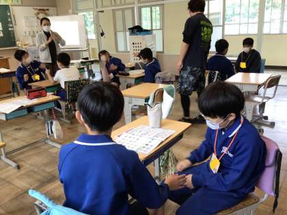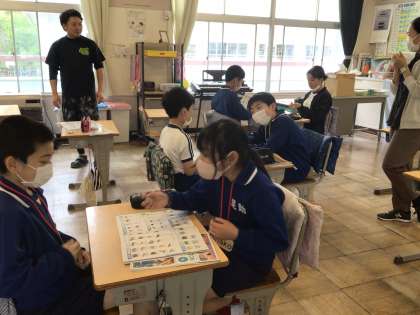 4月30日(火)、6年生はALTの先生と英語の学習です。テーマに合わせた言葉を英語で言えたら、相手に消しゴムを渡します。タイマーが鳴ったときに、消しゴムを持っていた子の負けです。必死で消しゴムを受け渡す6年生です。