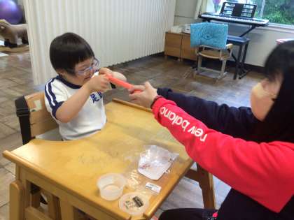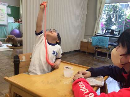 わくわく1組 ひっぱりっこ 公開日 2024/05/01 更新日 2024/05/01 各学年から 5月1日(水)、わくわく1組さんはよく伸びる粘土でひっぱりっこです。指先を上手に使って、とても長く伸ばすことができました。