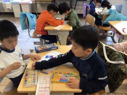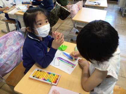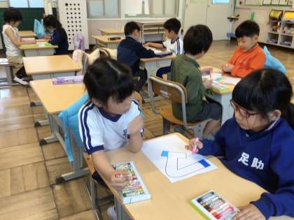 1年生 級訓づくり 公開日 2024/05/07 更新日 2024/05/07 各学年から 5月7日(火)、1年生は級訓「スマイル」の色塗りをしていました。友達同士で協力して、とてもカラフルな文字になっていました。
