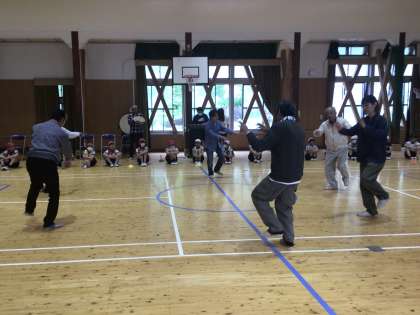 運動会練習 綾渡踊り 1 公開日 2024/05/16 更新日 2024/05/16 学校行事 5月16日(木)、運動会にみんなで演じる、ユネスコ無形文化遺産に指定された「綾渡踊り」の練習をしました。保存会の方に来ていただき、生歌での贅沢な練習時間となりました。 まずは、プロの踊りを見せていただきました。