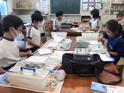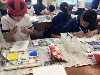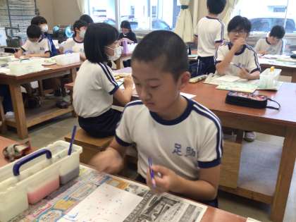 5月16日(木)、5年生は絵の具を使って、いろいろな技法で「心の模様」を表現していました。勢いよく筆を叩いたり、ストローで吹いたりするなど、思いがけなく出た形を生かして描いていました。