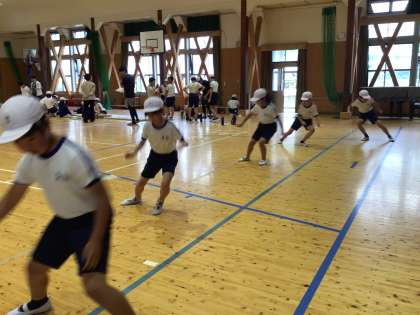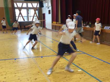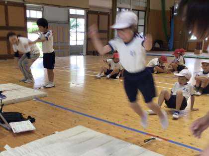講堂では5種目を行います。 立ち幅跳びと反復横跳びの様子です。