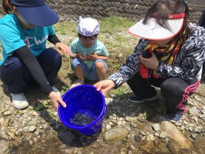 子どもたちのバケツから、次々と鮎が川に泳ぎ出していきました。