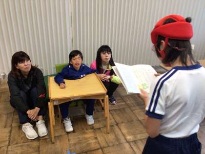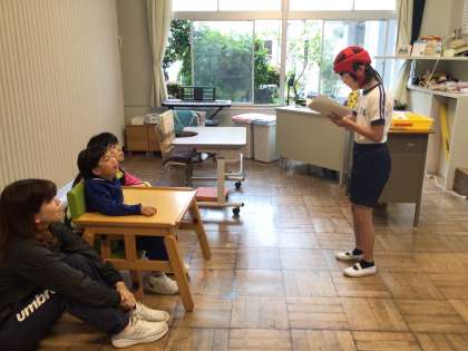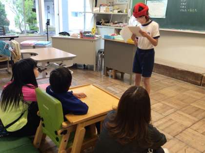 5月27日(月)、わくわく2組で読み聞かせをしていました。前に出て、カエルのお話を読んであげています。お客さんは3人です。がんばって読みました。