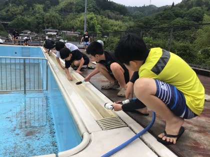 5月31日(金)、曇り空で気温もなかなか上がらない中でしたが、5・6年生がプール掃除を行いました。まずは、プールサイドや溝をごしごし磨きます。1年分の汚れはなかなか落ちず、力を込めて磨きました。